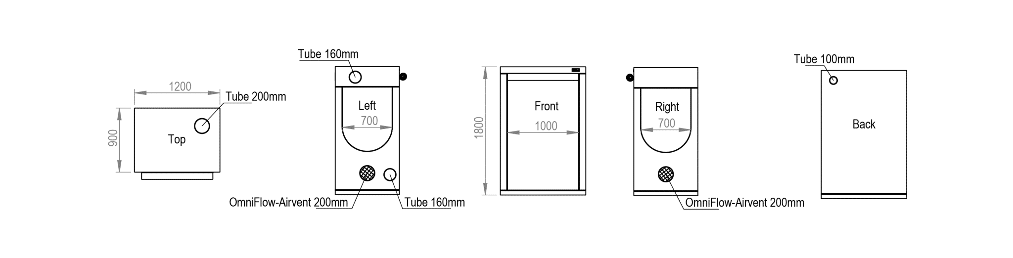 1x putki (Ø100 mm) takaseinällä 2x putki (Ø160 mm) vasemmalla sivulla 1x putki (Ø200 mm) katossa 2x OmniFlow-Airvent (Ø200 mm): 1x vasemmalla sivulla, 1x oikealla sivulla