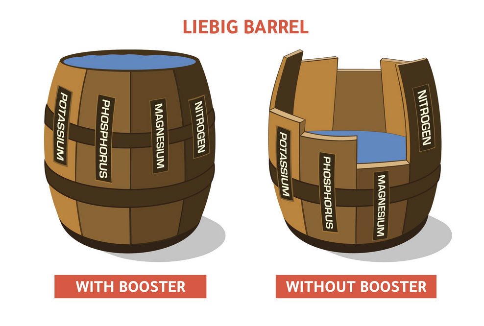 Maaperän runsaimmin saatavilla olevan ravinteen hyöty on vain yhtä hyvä kuin kaikkein niukimmin saatavilla olevan ravinteen määrä.Booster PK+ sisältää paitsi fosforia (P) ja kaliumia (K) myös ylimääräistä magnesiumia (Mg) sekä hivenaineita. Näin varmistamme ravinnepitoisuuden tasapainon ja sen, ettei mikään yksittäinen alkuaine puutu ja siten rajoita muiden ravinteiden imeytymistä.